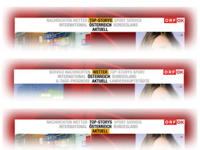 Die Besonderheit an allen ORF-Portalen ist, dass der Navigator den jeweils angewählten Menüpunkt in die Mitte des Navigationsbalkens zieht. Die erwünschte Information rückt also ins Zentrum des persönlichen Fokus des Zusehers.